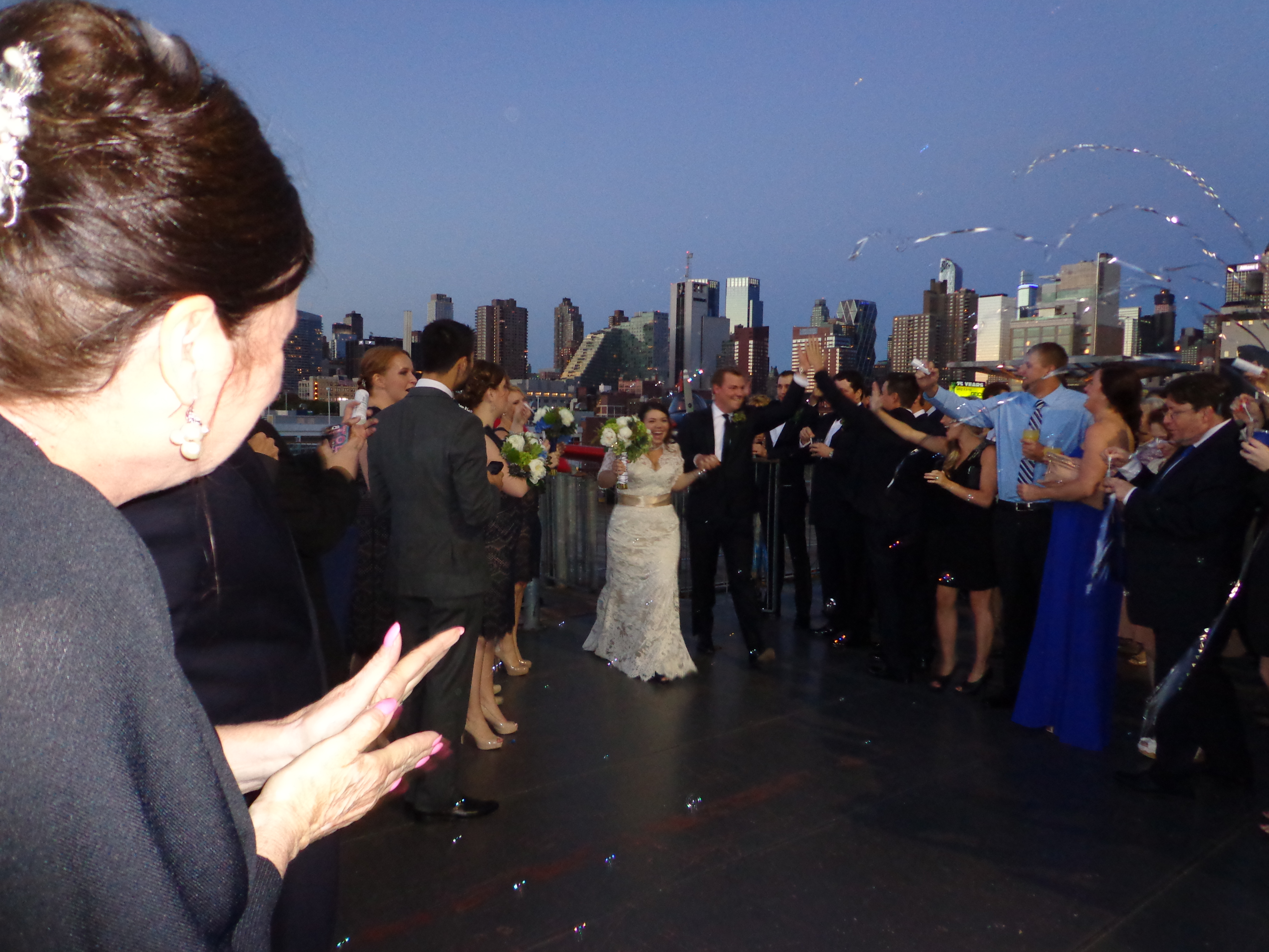 With NYC skyline as a backdrop, Tyler and Amanda Schott arrive on the upper deck of the Intrepid.