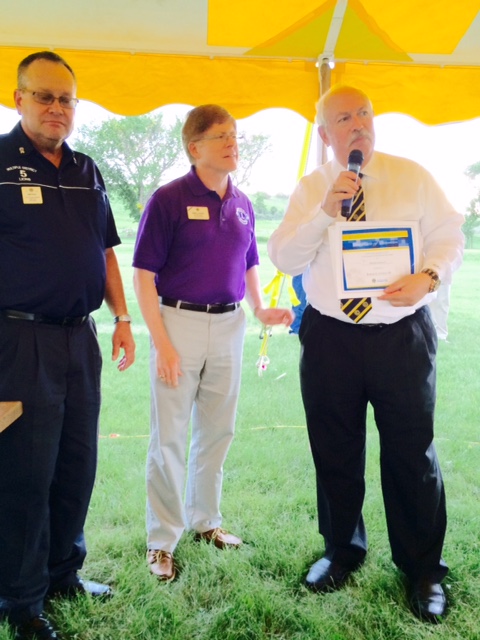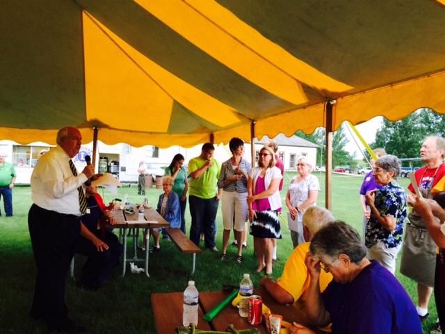 Our first activity was the 50th Anniversary celebration of the Sheldon (ND) Lions Club. The only remaining charter member, PDG Gerald Sletmoe organized a pitchfork barbecue supper that brought Kathy and me, along with two Past International Directors and their spouses–Bill and Marilyn Gackle and Bruce and Julie Schwartz–and representatives from 12 clubs to the event. District Governor Rick and Kristi Swenson made their first official visit, and several other PDGs were in attendance. Area Lions Clubs assisted with the barbecue and providing the large tent. It was a fun night.