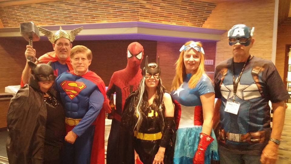 Fargo Lion Super Heroes (L to R): Cat Woman (Carla Lein), Thor (Rob Lein), Superman (Robert Littlefield), Spider Man (Mark Western), Bat Girl (Kathy Littlefield), Wonder Woman (Paula Swanson), and Captain America (Mel Olson). Not pictured: Milt Ota
