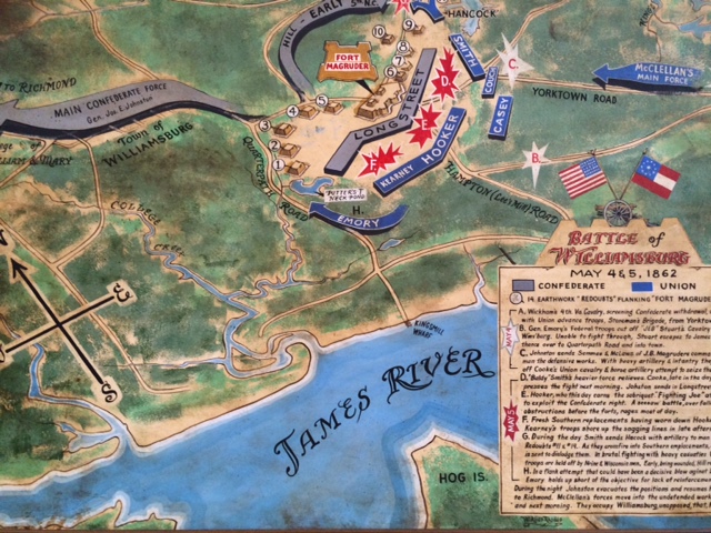 Leaving the downtown area and the Colonial period, it was unique to go back to the hotel witness the lobby display of this location’s connection to the Civil War era. I learned that this battle involving roughly 70,000 soldiers took place on May 5, 1862. Union General Hooker attacked this earthen embankment, but this offensive failed. The Confederates’ counter attack also failed, making this battle inconclusive. No matter because it is still historical, especially to me.