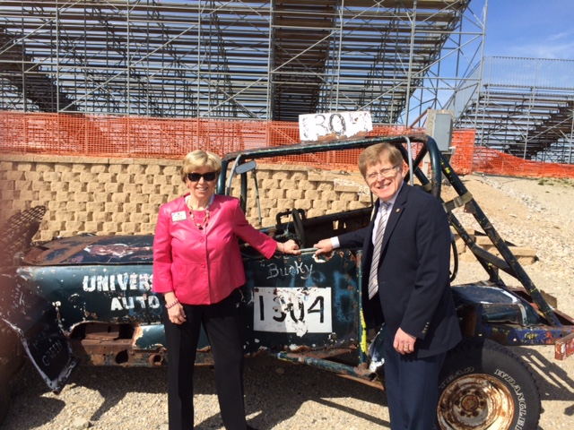 Lion Kathy and ID Robert pose in front of one of the original race cars at the facility.