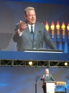 Former Vice President Al Gore delivers keynote address about protecting the environment–one of LCI’s centennial areas of service. The centennial flames from each Constitutional areas are displayed in the background.